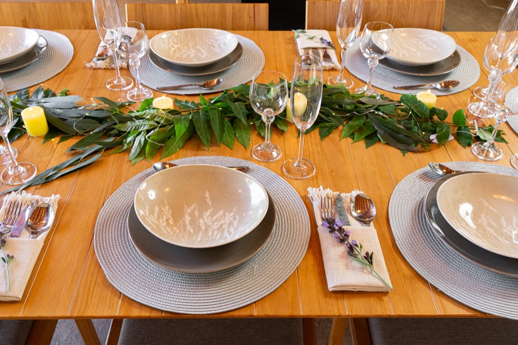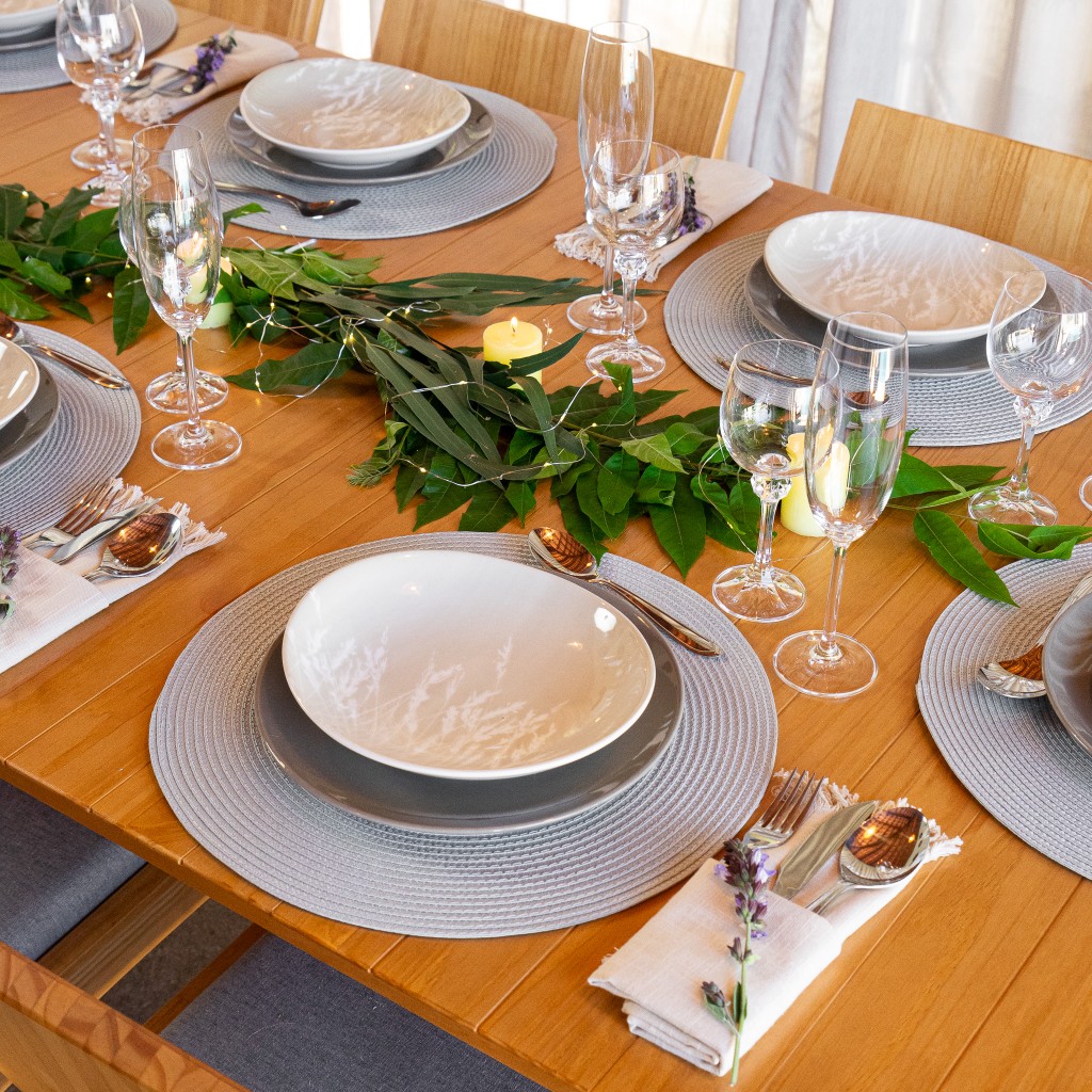 - Utilize sousplats neutros, como fibras naturais, cinza ou nude;