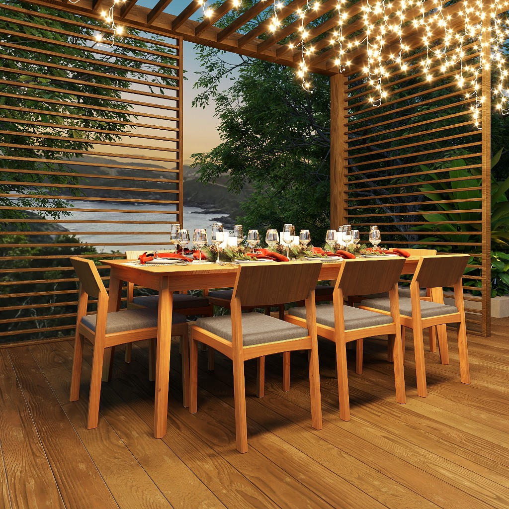 Montar uma mesa de Ano Novo na área externa é criar um espaço onde design, natureza e afeto se encontram. Com a Linha Less, essa experiência ganha ainda mais estilo: a simplicidade dos traços, a madeira maciça e o design atemporal proporcionam uma base perfeita para uma celebração inesquecível.