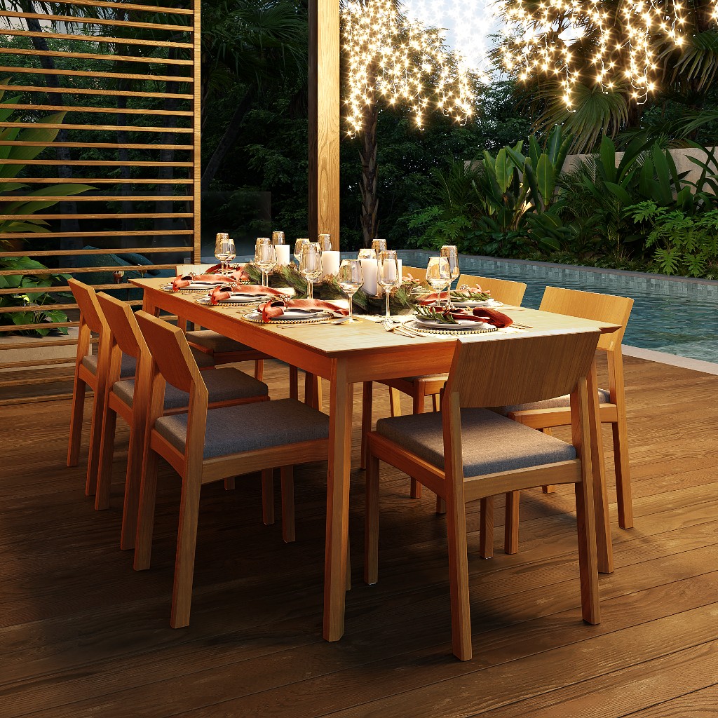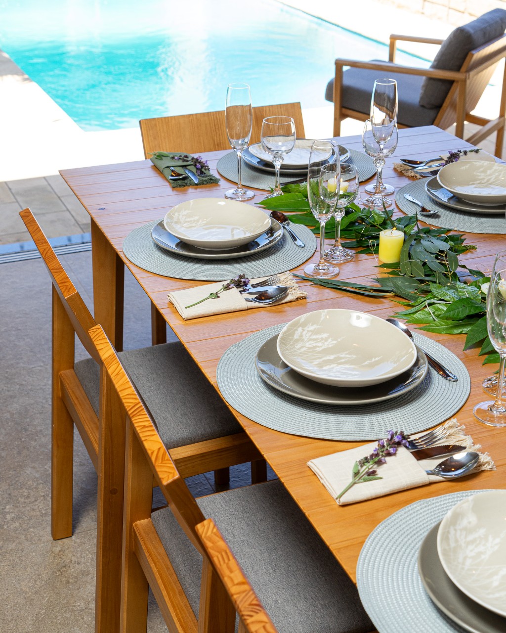 A estética minimalista da Linha Less traz um charme próprio para uma mesa posta ao ar livre. A madeira maciça dialoga com o entorno — seja o verde das plantas, a textura das pedras ou o azul da piscina — criando uma composição orgânica e harmônica.