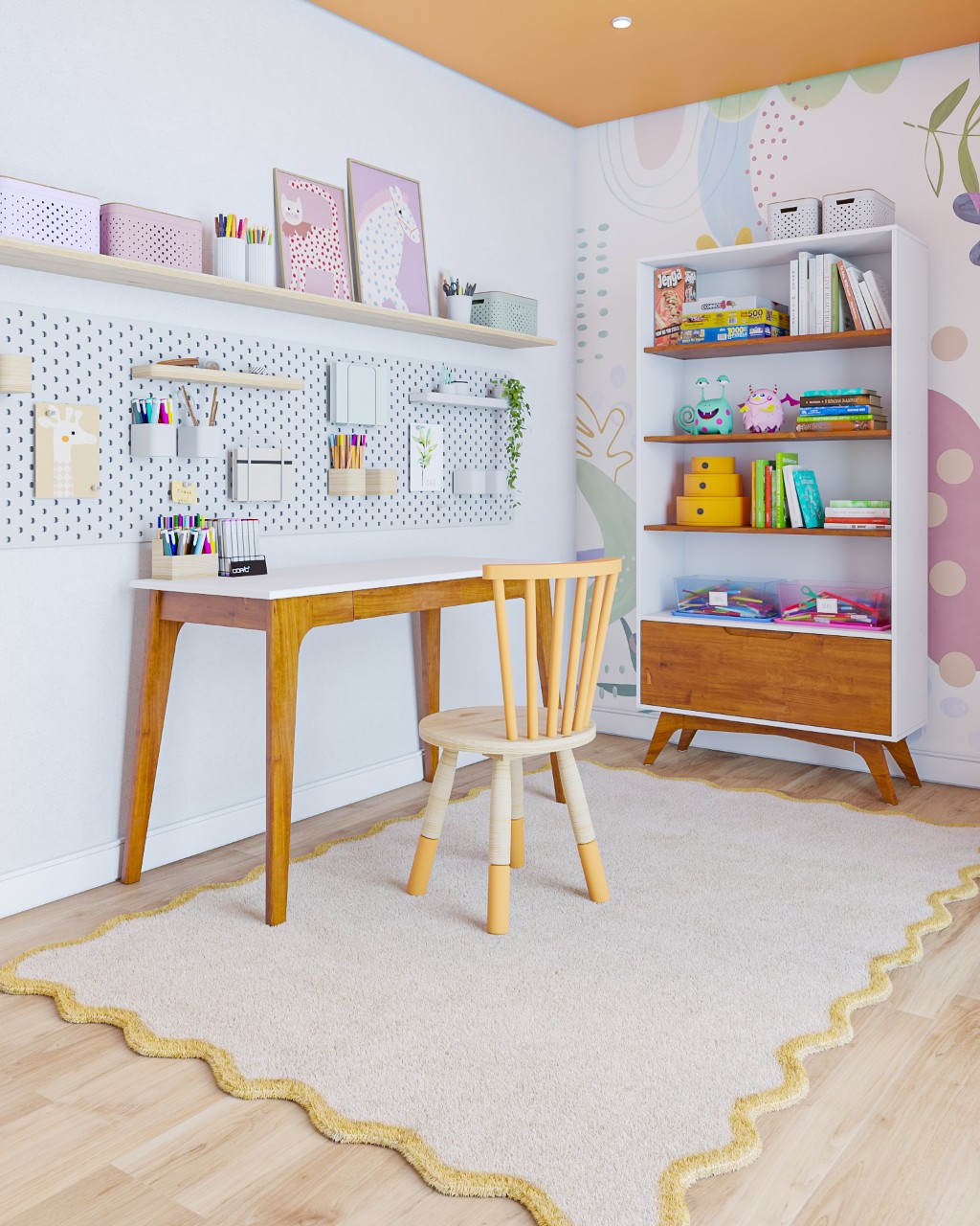 Um ambiente organizado ajuda — e muito — na concentração. Manter apenas o essencial sobre a mesa reduz distrações e deixa o espaço mais funcional. Caixas organizadoras, estantes, prateleiras ou nichos próximos à escrivaninha são ótimos aliados para guardar livros e materiais sem comprometer o visual.