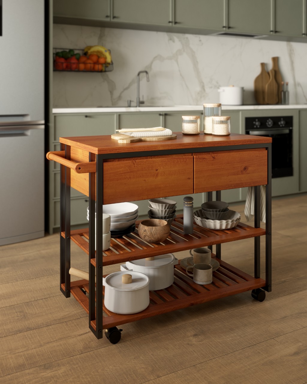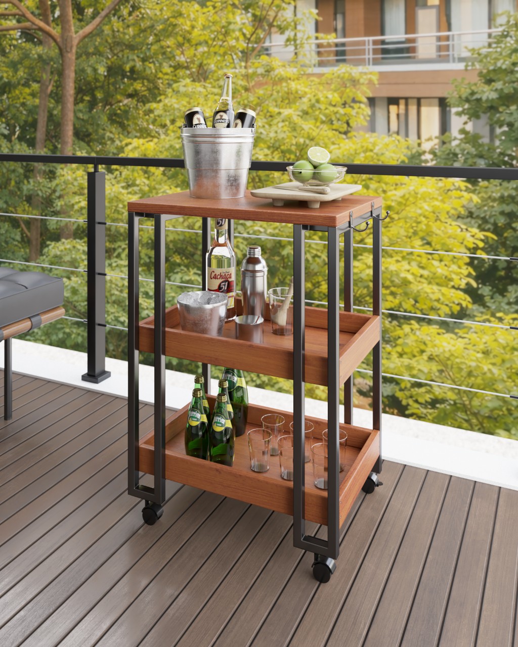 Já para quem busca mobilidade no dia a dia, os carrinhos da Linha Industrial se destacam pelos rodízios, que permitem transitar facilmente entre ambientes — da cozinha à área externa — acompanhando diferentes momentos de uso.