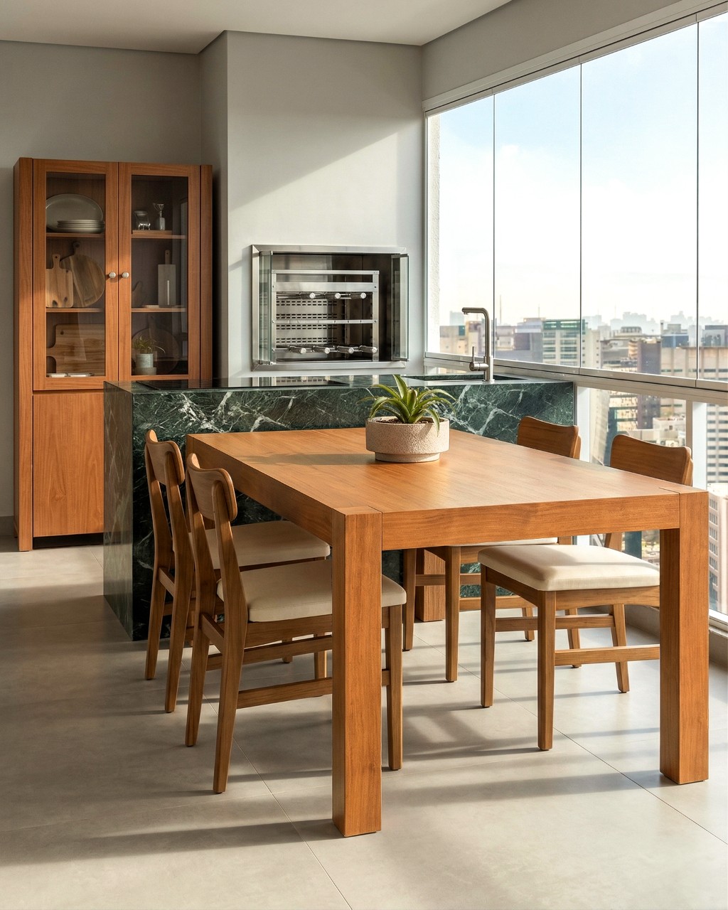 Dica: em encontros maiores, posicione o aparador próximo à mesa de jantar para criar uma área de apoio contínua — ou explore seu uso como bar lateral, organizando bebidas e acessórios de forma prática e visualmente elegante.