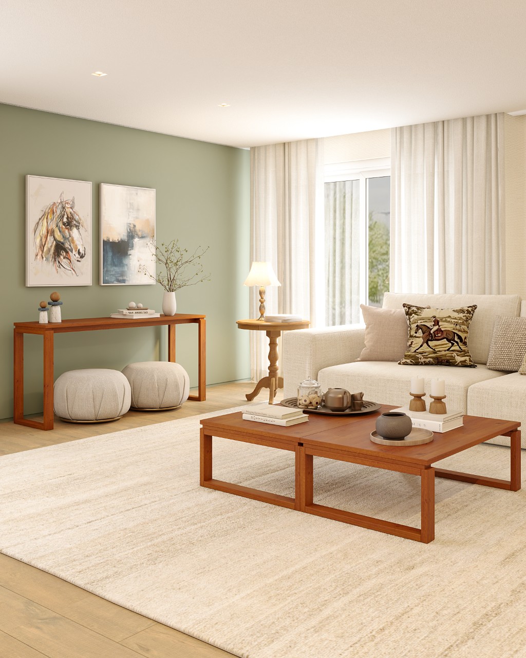 A mesa de centro é o eixo da sala. Ela ancora o layout, equilibra o sofá e cria um ponto focal imediato. Em ambientes amplos, é praticamente indispensável.