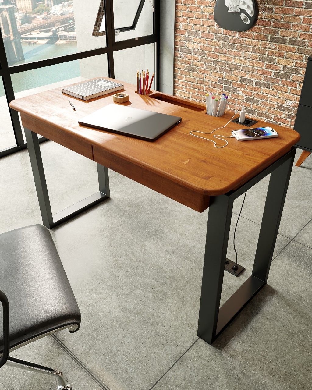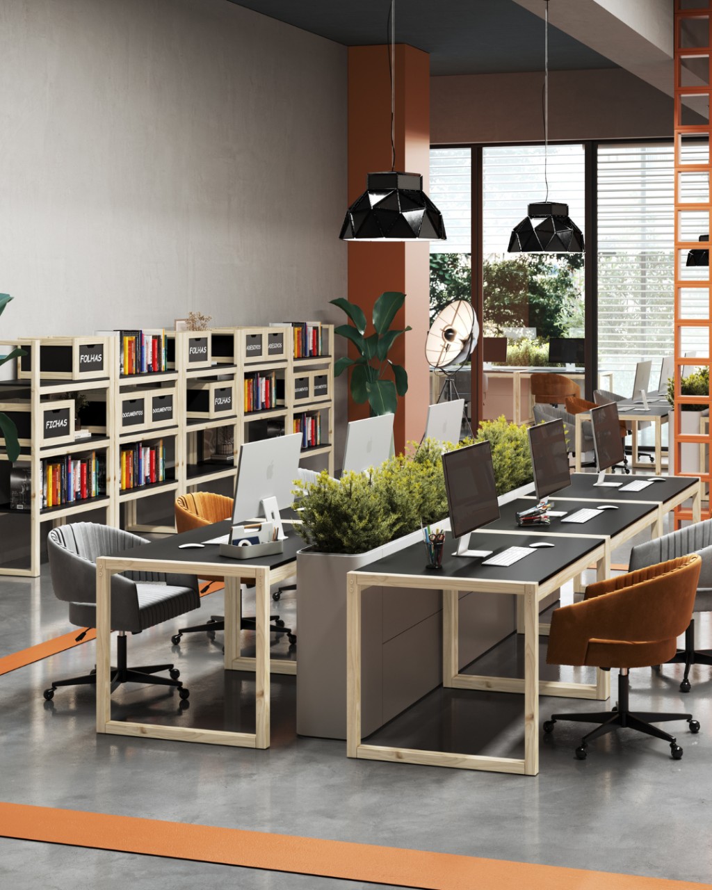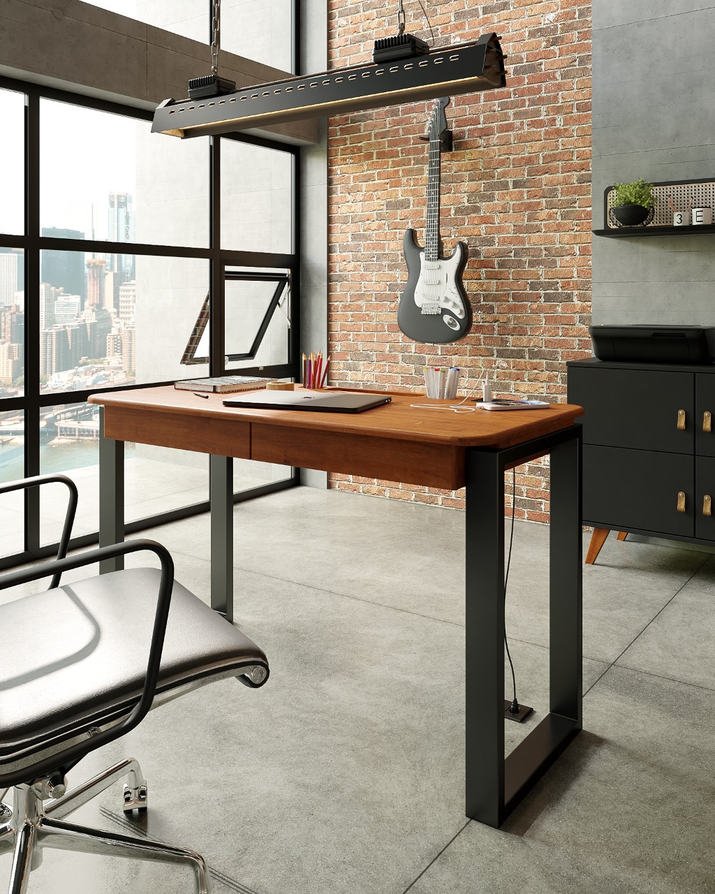 Inspirado em galpões urbanos e escritórios criativos, o industrial aparece mais refinado. Estruturas metálicas pretas, madeira de tom médio, como Garapa, e design funcional ganham espaço. Mesas robustas, estantes abertas e gaveteiros de metal são ideais para quem busca um visual marcante e urbano.