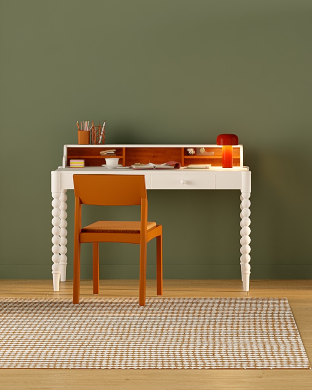 na imagem: Escrivaninha Poá Off White e Cadeira Less Terracota