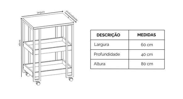 Dimensões Móvel Montado (LxPxA): 60 cm x 40 cm x 80 cm