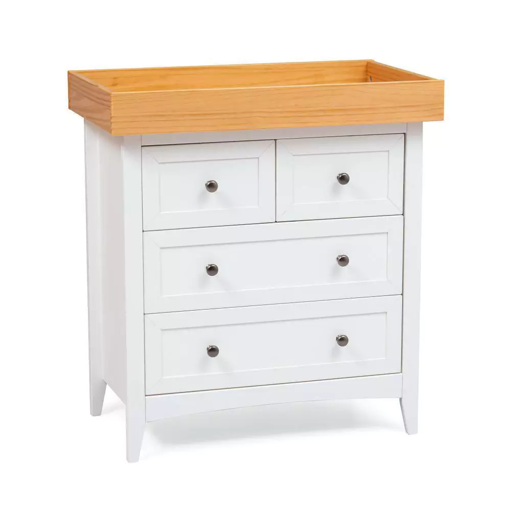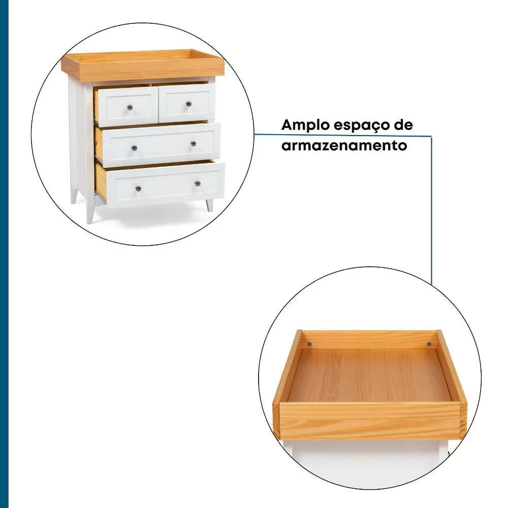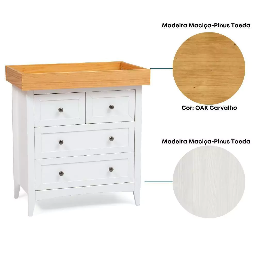 A Cômoda 4 Gavetas com Trocador Branco Nest possui desenho tradicional. É uma peça compacta com 4 gavetas com amplo espaço para armazenagem, e trocador removível. É produzida em madeira maciça do tipo taeda, o que lhe confere uma maior durabilidade. Essa espécie de madeira é de reflorestamento e contém o selo do FSC, garantindo que 100% da madeira utilizada provenha de fontes renováveis e não agrida o meio ambiente.
