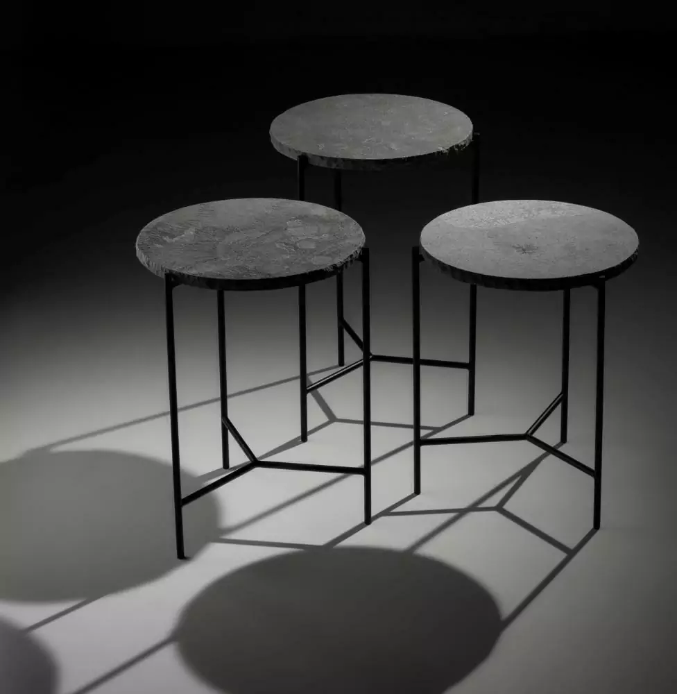 As mesinhas laterais Pietra unem a resistência do metal com a técnica do artesanal feito à mão. Enquanto as bases em metal, com desenho leve e elegante, garantem a estrutura necessária ao produto, os tampos agem como protagonistas. Feitos em basalto natural, oriundos das pedreiras de Nova Prata - RS, a Capital Nacional do Basalto, são talhados à mão, trazendo um formato orgânico, único em cada peça. O basalto natural possui alguns desenhos na superfície, que se deram pelo rápido resfriamento e cristalização do magma que chegou à superfície por meio de manifestações vulcânicas que ocorreram há milhões de anos. Devido a isso, é impossível extrair peças iguais, reforçando que cada peça será única e exclusiva.