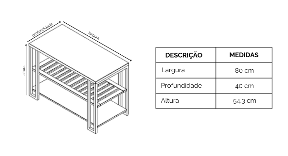 Dimensões Móvel Montado (LxPxA): 80 cm x 40 cm x 54,3 cm